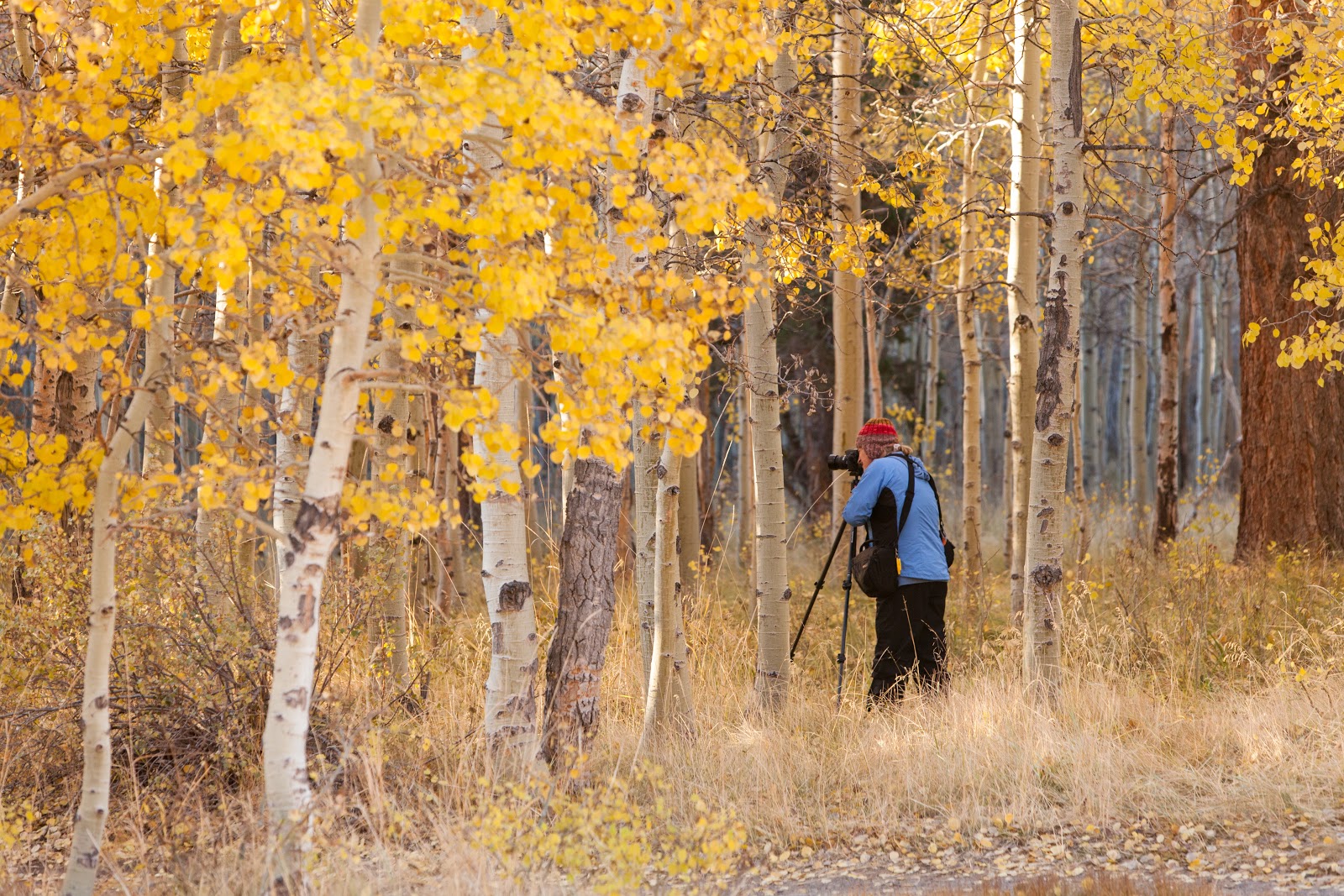 | Tena photographing the aspens, early morning at near Lundy Lake |